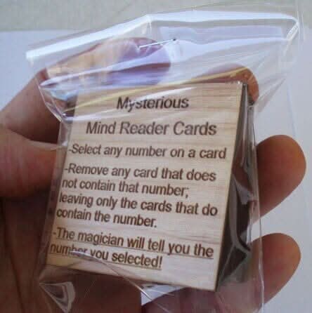 Want to amaze your friends with your ability to read their mind?? This will do it! There are 6 wood cards, each laser engraved with 59 or 60 different numbers. The numbers 1 through 60 are on the cards, with most repeated a number of times. Simply ask a friend to select a number but not to tell you. Then ask him to look at each card and turn over any that do not contain the number he is thinking of. Within seconds you will be able to tell him the chosen number!